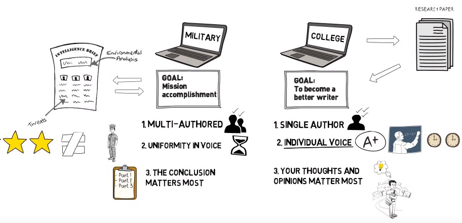 Despite their fundamental differences, the military and academia have much in common, particularly, if counterintuitively, when it comes to writing conventions.